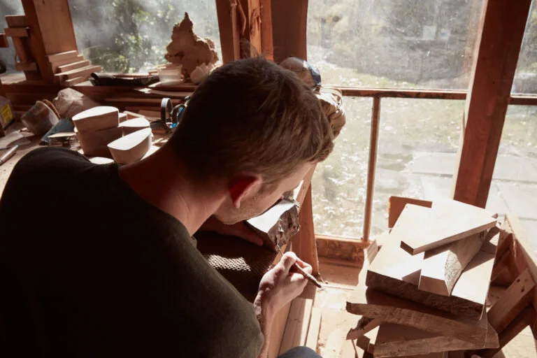 Brandon grew up, lives, and works within Bucks County Pennsylvania. As a child his play was drawing and building with legos or making stick forts in the forest. This engagement creating paving a path towards earning a Bachelor’s of Fine Arts degree focusing on oil painting and sculpture. After University he moved to Philadelphia to work with his family’s home remodeling company. While there he learned the ways of the carpenter, the efforts of hard labor, and the value that time and patience play in executing exquisite work. Aspiring to stay true to his ‘Artist’ title Brandon started experimenting by developing his own methods and style of furniture from collecting discarded cut offs and salvaging timbers. During this time Brandon met a wood artist who would become his mentor and who reinvigorated his love for the fine woodworking he had experienced in grade school shop classes. After 2 years in the city he retuned to Bucks county to pursue the arts. He became a painting instructor and an apprentice to a painting preservationist all the while being a freelance furniture maker and artist. In 2015 Brandon joined the George Nakashima Woodworkers team as an apprentice building conservationist, a documentarian, and woodworker. Today he is a full time woodworker with the Nakashima team and also creates Brandon originals from his home shop. In his free time he enjoys hiking in the vast Pennsylvania forests, exercising, and enjoys most of all his cat. Angus.